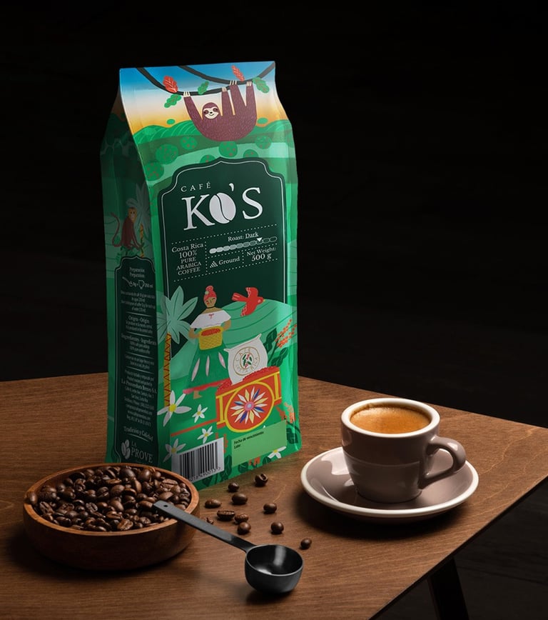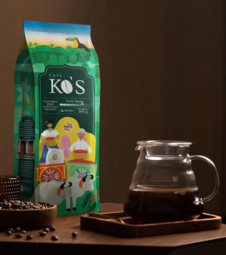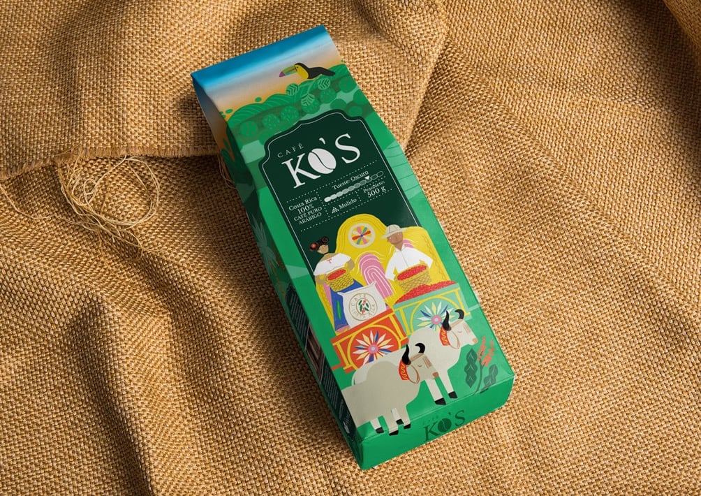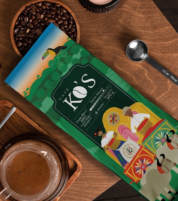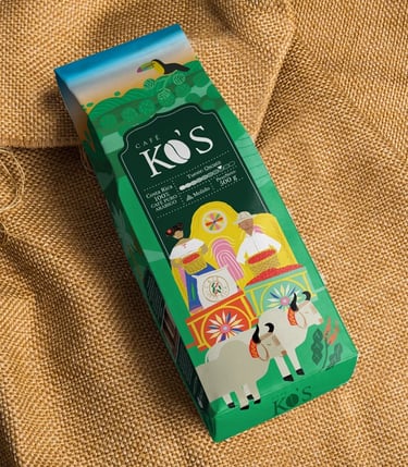 El diseño del packaging para el café KOS fusiona la pasión por el café con un poco de la identidad histórica de Costa Rica a través de ilustraciones cautivadoras. Cada detalle ilustrado muestra un ejemplo de nuestras raíces tipicas y naturales, reflejando el compromiso de KOS con la calidad y la tradición. Con colores vibrantes y detalles auténticos, nuestro empaque transporta a los amantes del café a los exuberantes campos de Costa Rica con cada sorbo.